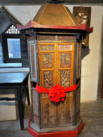 When we climbed to the second floor, I noted that the stair steps were really narrow, so much so that I had to turn my foot sideways to ascend. Our guide said that was because the only ones who spent time upstairs were women and children. And the women had bound feet. Our guide also showed us a palanquin on display that was used to carry the women whenever they went out of the house to protect their bound feet.